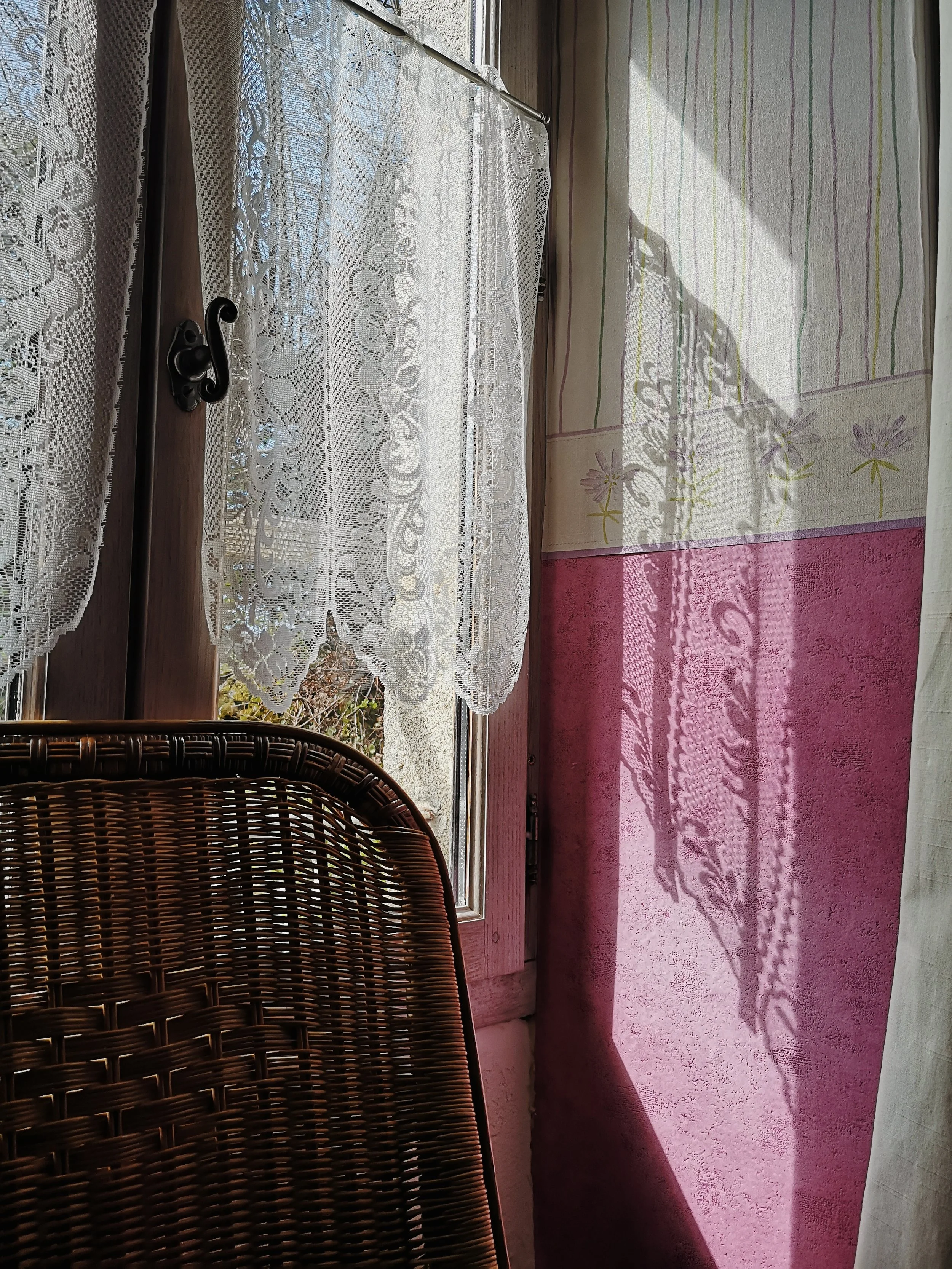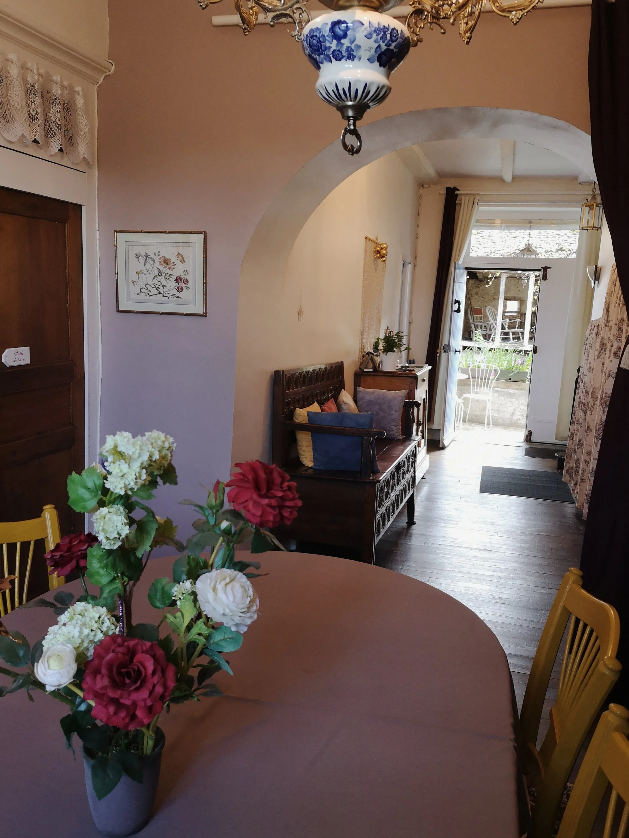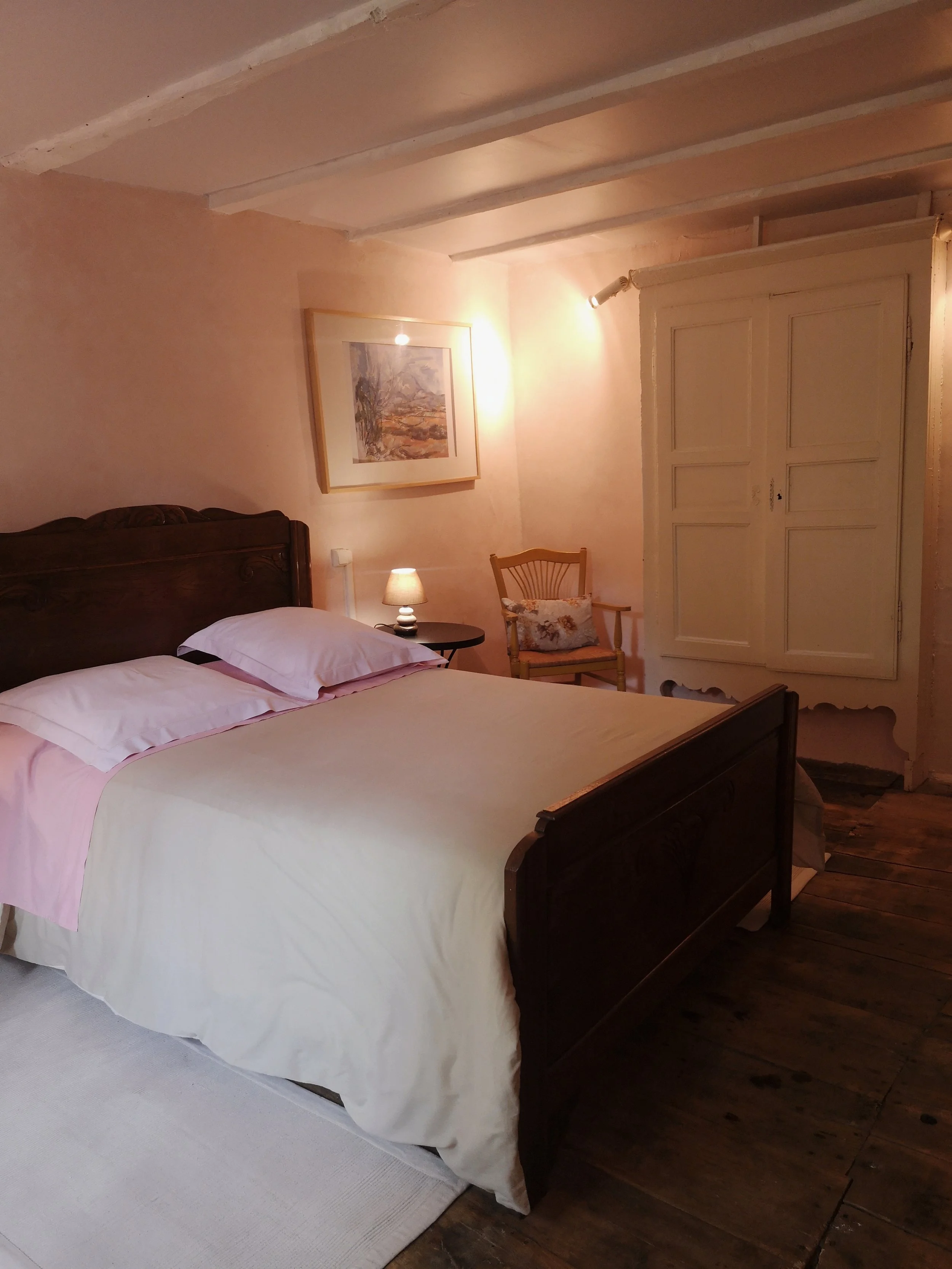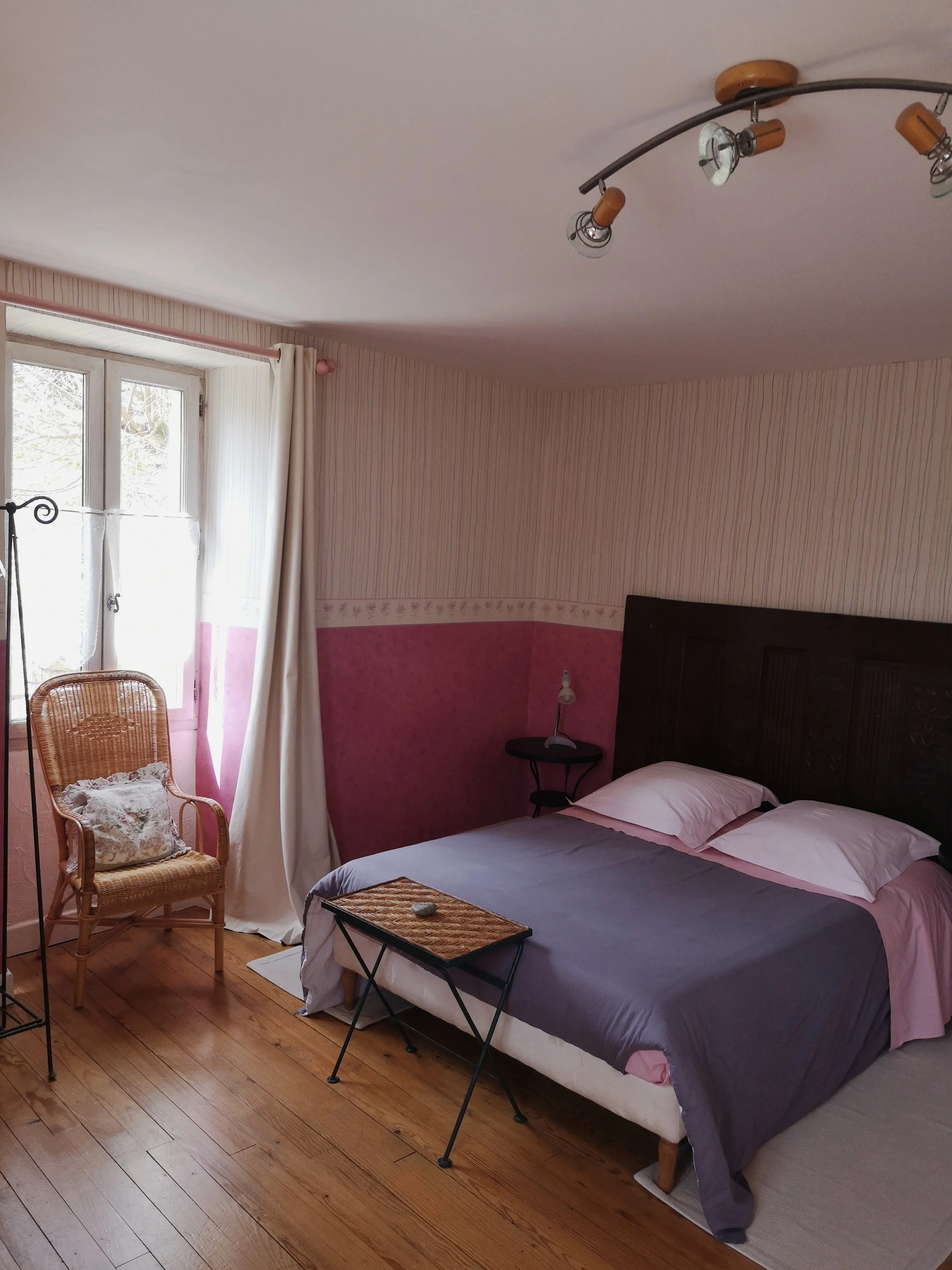 Cette chambre aux teintes de rose ensoleillée est très agréable et protégée par le Ginkgo biloba qui trône dans la cour. Il est aussi appelé “arbre au mille écus”.